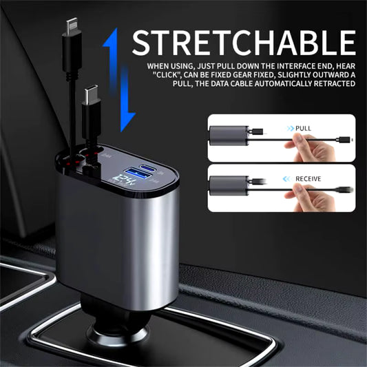 120W 4 in 1 Retractable Car Charger USB Type C Cable for Iphone Xiaomi Huawei Samsung Fast Charge Cord Cigarette Lighter Adapter
